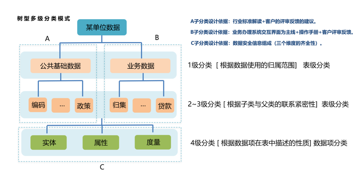 數據分類常采用樹型多級分類模式。該模式分類的顆粒度與層數以及分層類別的類別數據正向關聯。 在采用樹型分類模式,樹的深度盡量控制在四層以內,每個大類下的小類層次,沒有強制需要層數一樣, 但盡量保持一致,具體根據數據需求、業務需求來確定,每層的小類寬度是根據分類因子劃分的結果來確定的。