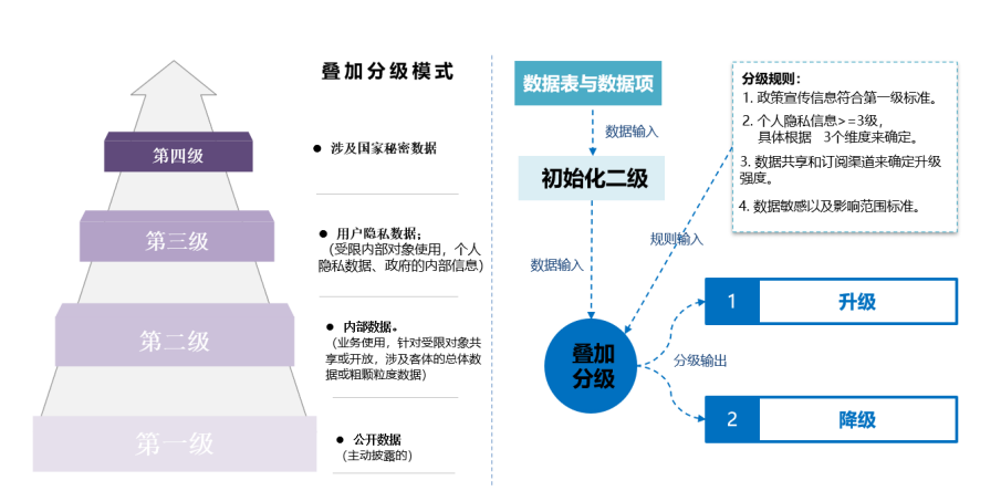 疊加分級模式采用靜態定級+動態變更級別的方式對數據進行分級,適合業務應用場景廣,業務渠道多的單位。