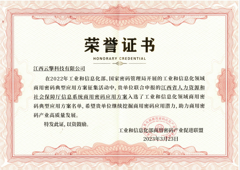2023年3月23日,首屆工業和信息化領域商用密碼應用峰會于浙江杭州隆重召開,云擎科技聯合申報的《江西省人力資源和社會保障廳信息系統商業密碼應用方案》 入選工業和信息化領域商用密碼典型應用方案,成為全省唯一入選的政務信息系統商用密碼解決方案。 該方案可廣泛應用于非涉密政務信息系統密碼保障體系的新建、改造和完善,在身份鑒別、信息安全隔離、信息加密、數據完整性保護等方面發揮重要作用。